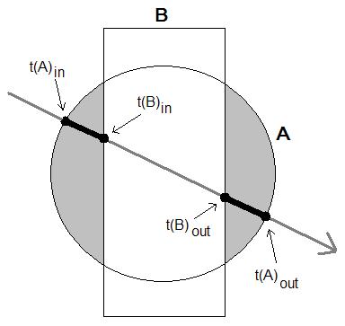 If t(A)in < t(B)in < t(B)out < t(A)in, then the boolean difference A - B is described along this ray by: [ t(A)in t(B)in t(B)out t(A)out ]. |