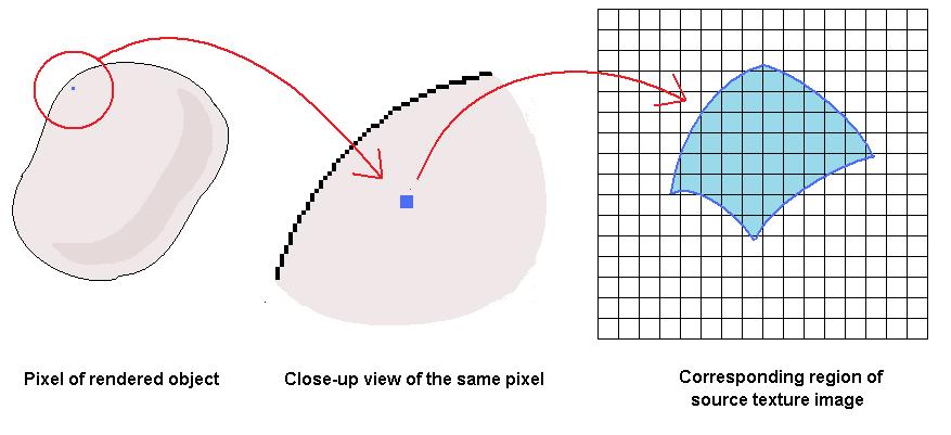 In the diagram the arrow goes from the image source location (u,v) to the object surface point (x,y,z), because this is the way we generally think of the texture mapping as being from an image to a 3D object. But in practice we actually need to compute the inverse function: While we are rendering the scene we have a point (x,y,z) on an object's surface, and we need to go from there to a location (u,v) in a texture source image.