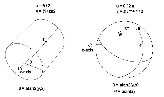 There are a number of ways to define this inverse mapping function f: (x,y,z) → (u,v). One general set of techniques is referred to as projection mapping, so called because it consiste of some way of "projecting" down from a three dimensional space to a two dimensional space. Which type of projection to use depends upon the shape of the object you want to texture.