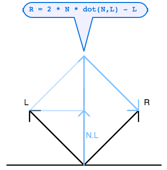 The Phong model begins by defining a reflection vector R, which is a reflection of the